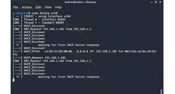 Хорошо, адрес DHCP-сервера получен, запускаем DHCP DISCOVER flood, чтобы никто не мог получить IP-адрес от легитимного DHCP-сервера (рисунки 5.7 5.8).