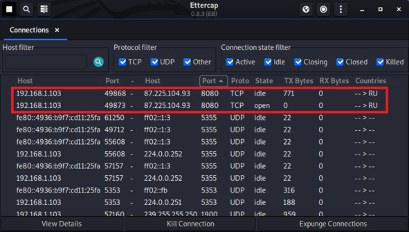 Обратите внимание на то, что MAC-адрес отправителя благодаря встроенному MAC-spoofing не совпал ни с исходным MAC-адресом злоумышленника, ни с тем, на который мы его сменили.