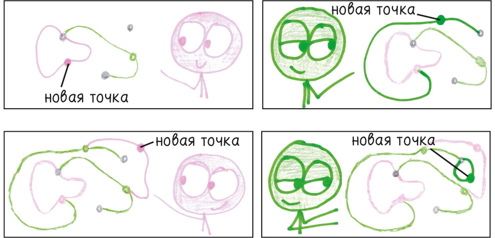 Это уравнение верно на любом этапе игры для всех возможных сценариев, от простейшего до сложнейшего, независимо от того, начинаете ли вы с двух точек или с двух миллионов. В любой ситуации количество точек плюс количество замкнутых областей будет равно количеству линий, соединяющих точки, плюс количество отдельных фигур[12].