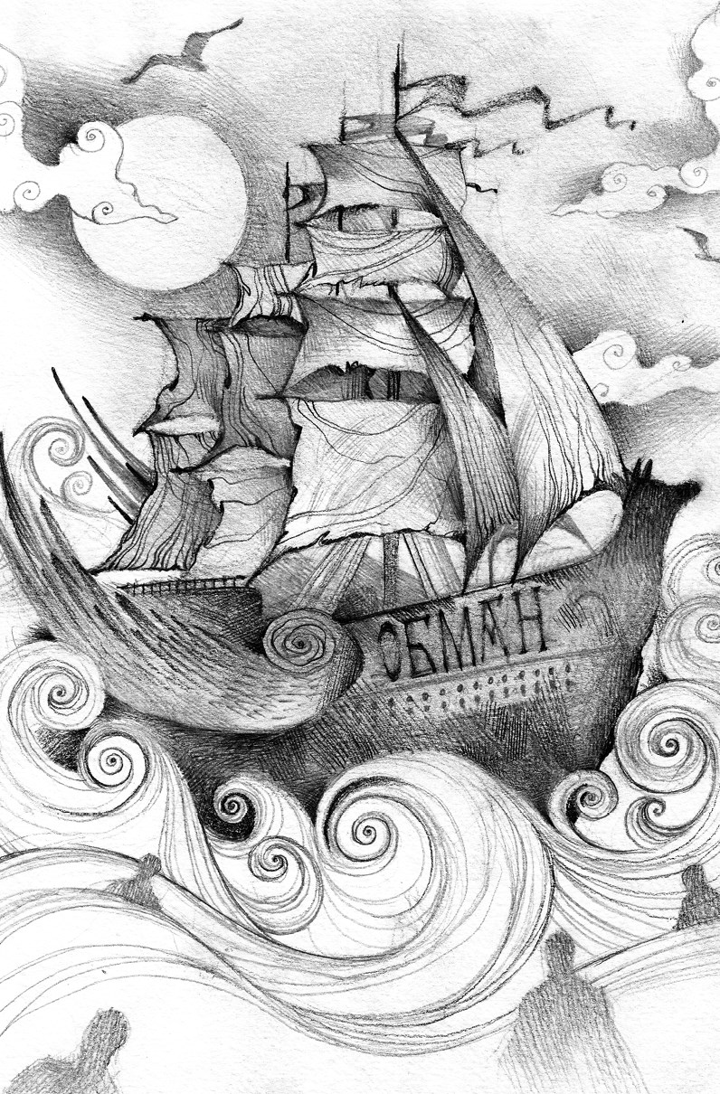 Перед Снежком властно держался на ужасной глубине трехэтажный корабль, на боку которого каллиграфическими буквами было написано «Обман». Корабль разделялся на три части, то есть три этажа, где за тысячами окон располагались отделы для пассажиров, матросов, капитанов и прочих работников. На звериных боках корабля расположились теперь уже сложенные орлиные крылья. В качестве завершающей детали, дополняющей противоречивый образ корабля, бушприт в виде волчьей головы, как будто застывшей перед образом смерти.