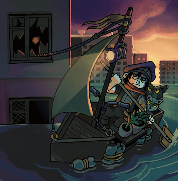 На последнем этапе запланированных дел необходимо было выломать окно, а как иначе переместить лодку наружу? За окном темнело, крики и стуки в дверь его квартиры становились всё громче. Дождь прекратился, но вода продолжала медленно прибывать. Следовало торопиться, и Клос, взяв в руки топор и молоток, ловко отделил оконную раму от проёма и вытолкнул её наружу, стараясь не разбить стекло. Окно шлёпнулось о воду и немедленно пошло ко дну, а поднятая волна с плеском приземлилась на пол балкона, обрызгав белого кота. Тот фыркнул, резко отскочил, а затем ловко запрыгнул в лодку.