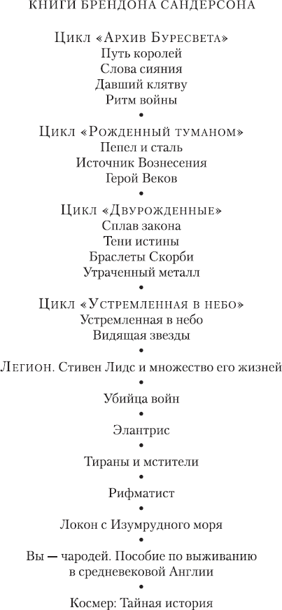 Могу предположить, что большинство моих читателей толком не знают, как связаны между собой все мои книги, в каждой из которых помимо основного сюжета прячется тайный. Мне это нравится. Я не раз говорил, что не хочу вынуждать читателей зазубривать наизусть все мои книги, чтобы получать от них удовольствие. Пока «Рожденный туманом» это просто «Рожденный туманом», а «Архив Буресвета» это «Архив Буресвета». Истории этих миров первостепенны.