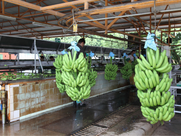 Мы остановились около фабрики Del Monte, где пакуют бананы в коробки. Плантация рядом. Гроздья бананов растут в синих пластиковых мешках, так при опылении химия не попадает на плоды. Эти мешки с бананами срывают и подвешивают на крючья канатной дороги. Партию 1020 мешков тянет на веревке рабочий. В первом цехе (это просто навес) мешки срывают и бананы бросают в ванну. После быстрого помыва бананы идут на конвейер, где они сушатся, разрываются на мелкие гроздья и пакуются в коробки. В таком виде они приходят в наши магазины.