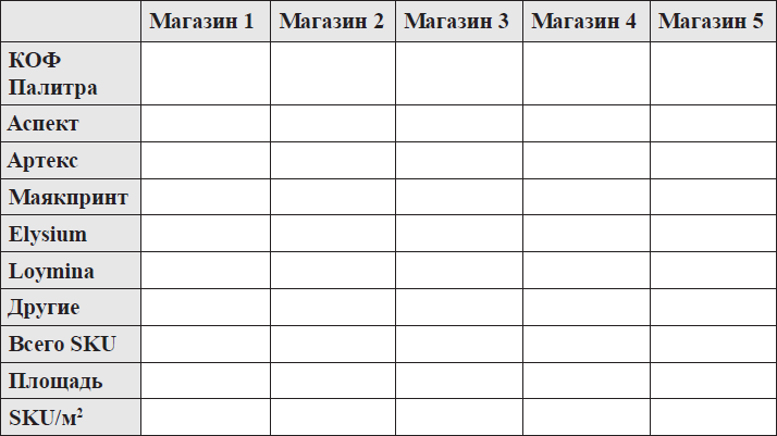 Обязательно выписывайте представленные фабрики. Потом, когда будете формировать ассортимент, слабо представленные производители, возможно, помогут вам отстроиться. Неплохо составить сводную матрицу по всем магазинам, которые посещаете, будет наглядно. На это можно будет опираться при отборе коллекций в свою матрицу в дальнейшем. Выглядеть таблица будет примерно так.
