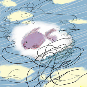 «В глубине потускневшего неба, где облака сливаются с бесконечностью, Печальная Рыба медленно прокладывает свой путь. Она, словно дух из другого мира, стала символом загадочности этой вселенной.
