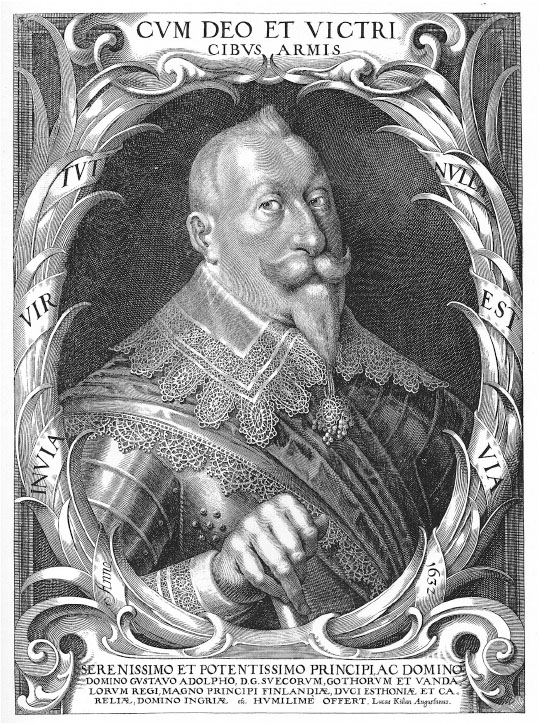 Король Швеции с 1611 по 1632 г. Густав II Адольф. Портрет, выгравированный Лукасом Килианом, около 1632 г.