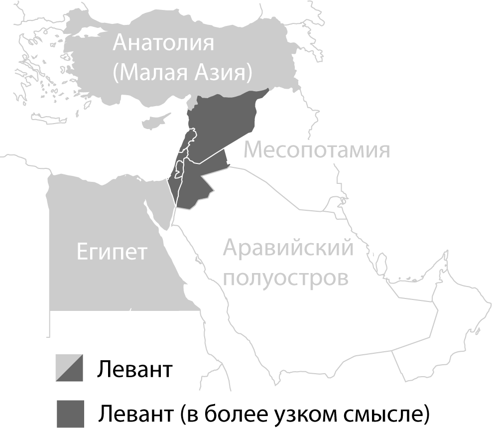 Термин «Левант»[21] в своё время европейцы употребляли в значении, в котором мы сегодня употребляем понятие «Ближний Восток». Левант описывали как «перекрёсток» между Передней Азией, Восточным Средиземноморьем и Северо-Восточной Африкой, но определения неоднократно менялись. Термин активно использовался до середины 20-го века, позже встречался разве только в книгах по истории и археологии. Не так давно понятие «Левант» было снова воскрешено в медиапространстве благодаря широкому освещению деятельности террористической организации ИГИЛ[22], название которой расшифровывается как «Исламское государство Ирака и Леванта». Кроме «Леванта», примерно в том же историческом и географическом значении можно встретить термины «Большая Сирия», «Великая Сирия» и «Шам» (классическое арабское название Сирии).