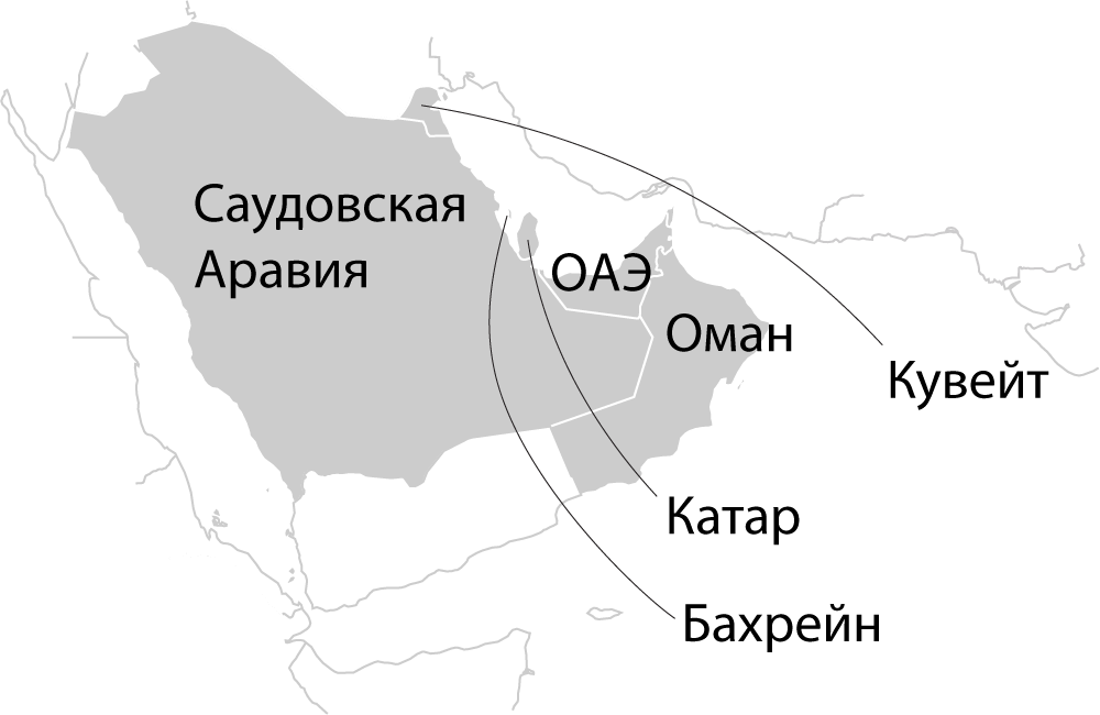 Члены ССАГПЗ: Бахрейн, Катар, Кувейт, ОАЭ, Оман и Саудовская Аравия.