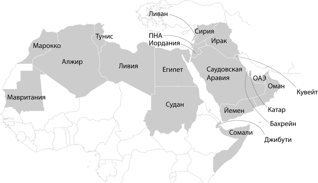 Когда говорят «арабские страны», часто подразумевают Лигу арабских государств, хотя среди нынешних 22 стран-членов только в 19 арабский язык является родным для большинства граждан[20].
