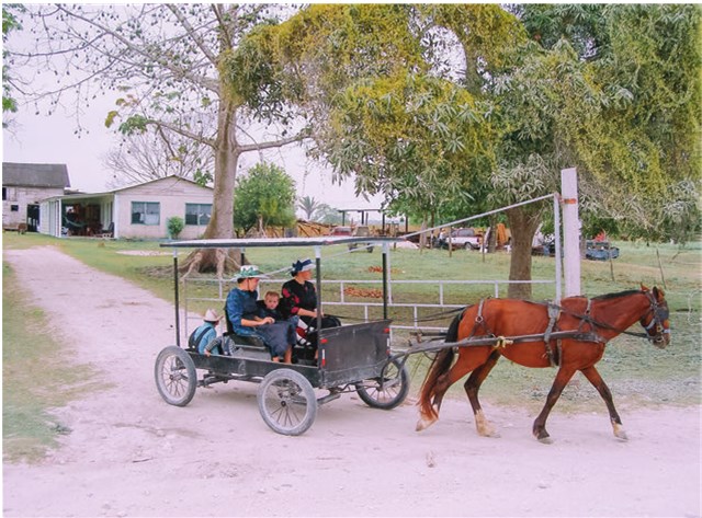 Отяжелевшее красное солнце скрылось за деревьями. Я вышел на дорогу, но уже начал представлять, как вернусь обратно в лес и поставлю палатку на радость обезьянам. Вдруг на дороге показалась двуколка. Лошадью правил фермер в шляпе и клетчатой рубашке. Он приветливо кивнул залезай. Мы разговорились. Родной язык у меннонитов немецкий, но этот фермер знал испанский.