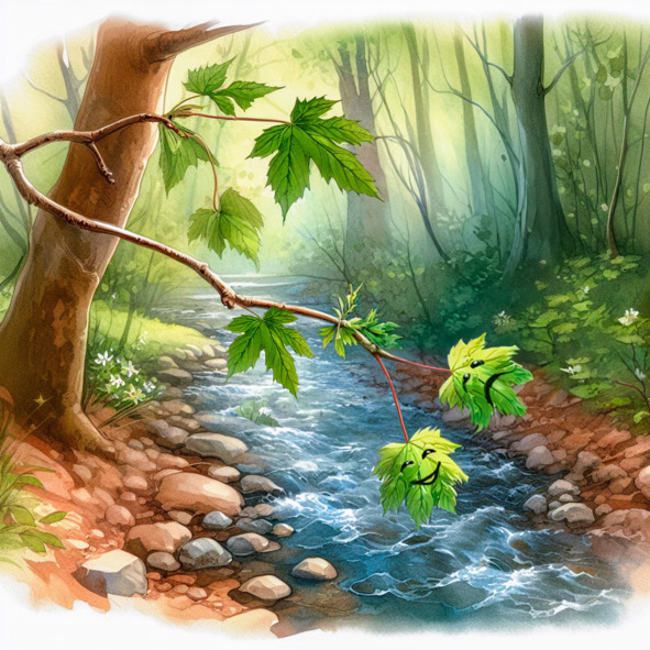 В то яркое майское утро, когда солнце рассыпало тысячи бликов по водной глади ручья и тёплый весенний ветерок игриво скользил по ветвям старого Клёна, на конце одной из нижних веточек, склонившейся над самой поверхностью воды раскрылась новая почка. Из неё, словно два любопытных глазка, выглянули два маленьких листика-близнеца.