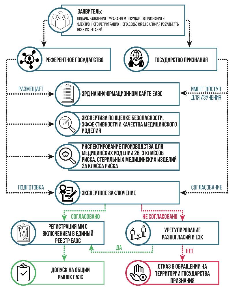 В общем виде механизм регистрации медицинского изделия в рамках Евразийского экономического союза выглядит так: