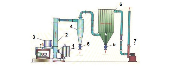 2 қуритиш камераси; 3 ҳўл целлюлаза порошогини юклаш ҳудуди; 4 циклон; 5 ҳаво оқимини ёпқич; 6 чанг тутгич қопи; 7 сўрувчи вентилятор.