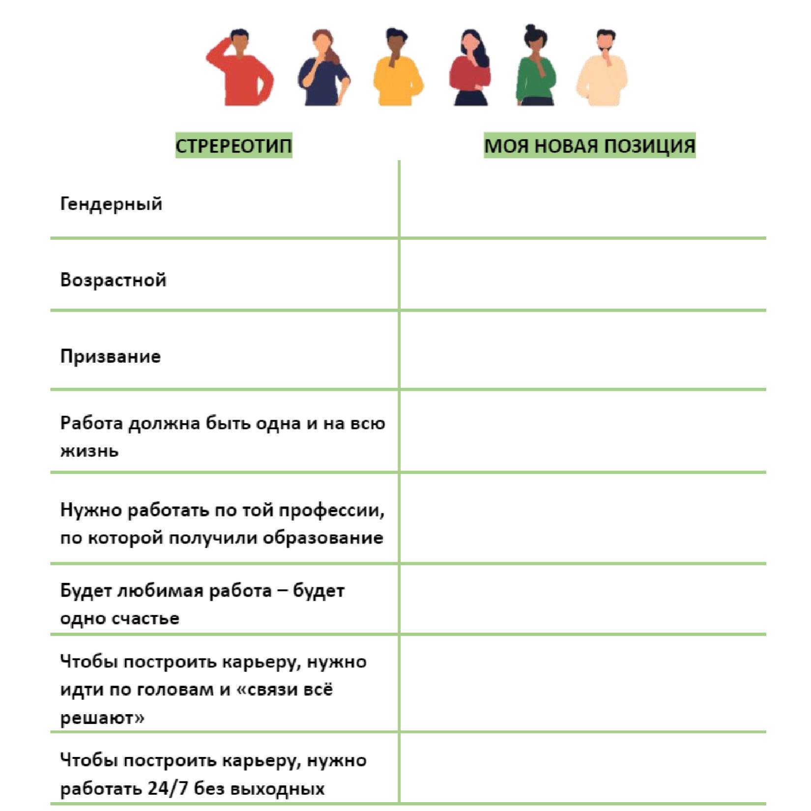 Были ли у вас стереотипы, связанные с профессиональной сферой? Если вы увидели их в данном списке, изменилась ли ваша позиция? Если да, то в задании ниже попробуйте сформулировать свою новую позицию.