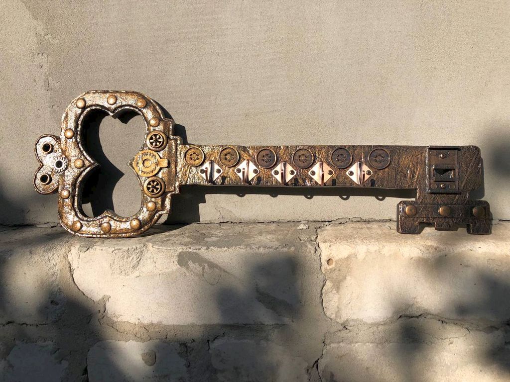 Ключик был выпилен по собственному эскизу прямо на листе от руки лобзиком. Затем был обклеен туалетной бумагой. Накладки на ручке и зубцах выполнены из картона, декоративные элементы крышечки от лекарств и заглушки от мебельной фурнитуры. А еще какая-то массивная пластиковая деталь от крепления. Сверху нанесен слой бесцветного нитролака. С тыльной стороны расположены два металлических подвеса для крепления на стену. Взрослые друзья остались довольны неожиданному подарку, а дети пришли в восторг.