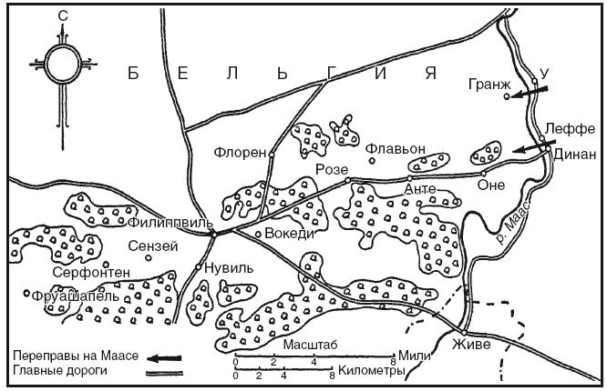 После отступления 1-й и 4-й французских кавалерийских дивизий передовые части Роммеля во второй половине дня 12 мая вышли на берег Мааса. Его целью было переправиться, если возможно, на плечах французов и захватить плацдарм на западном берегу. Но мосты в Динане и У были взорваны французами как раз в тот момент, когда передовые танки начали переправу, и потому Роммелю пришлось предпринять штурм и форсировать реку на резиновых лодках. Эта атака началась рано утром следующего дня и стоила тяжелых потерь, прежде чем увенчалась успехом. Роммель пишет: