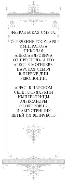 Февральская смута. Отречение государя императора Николая Александровича от престола и его арест в Могилеве. Царская семья в первые дни революции. Арест в Царском Селе государыни императрицы Александры Феодоровны и августейших детей их величеств