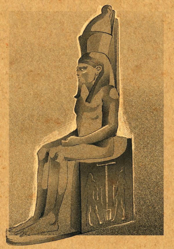 Иллюстрация статуи Атума в двойной короне Египта. Луксорский музей