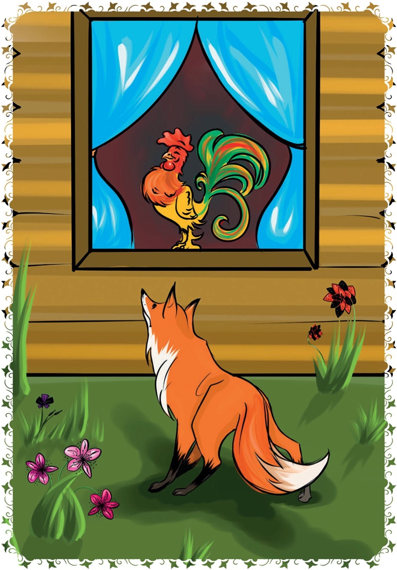Прибежала лисичка, стала петушка из хаты выманивать:
