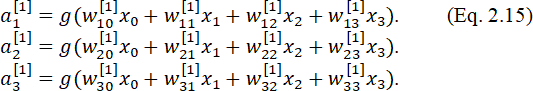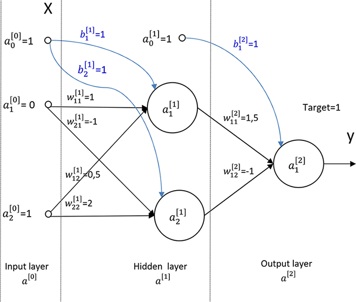 В этом примере (рисунок 2.11) веса нейронной сети будем обозначать символом w, смещения b. Номер слоя, как и ранее, указываем верхним индексом в квадратных скобках для того, чтобы не путать с индексом обучающего примера, номер нейрона в слое нижним индексом. Выход нейрона по-прежнему обозначаем символом а.