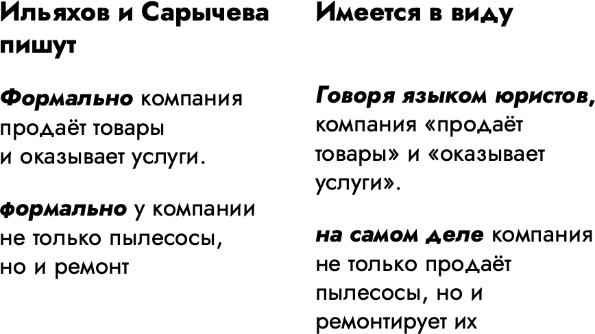 Но вершина бессмыслицы то, как Ильяхов и Сарычева пользуются наречием «формально». На наших глазах они прибегли к нему дважды, оба раза исказив значение слова. При этом первый случай хотя бы можно пусть и с натяжкой охарактеризовать как «неточность» в словоупотреблении. Но во втором случае смысл наречия оказывается перевран настолько, что меняется на 180 градусов.