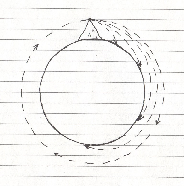 При наблюдении за полётом камня можно заметить интересную особенность: камень всегда летит по дуге, и в первую секунду путь его под действием силы притяжения отклонится от горизонтали на 5 метров. Это происходит независимо от скорости полёта, и даже наш камень-спутник, проделывая 7,9 км в каждую секунду, отклоняется от воображаемой касательной на 5 метров. Но, в отличие от других камней, спутник не падает на Землю, а всегда оказывается на одной высоте над её поверхностью.