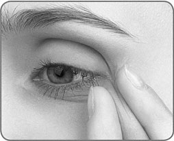 В случае перетирания тканей на верхнем веке, ближе к ресничной области, прием может производиться подушечками пальцев одной руки (большого и указательного).
