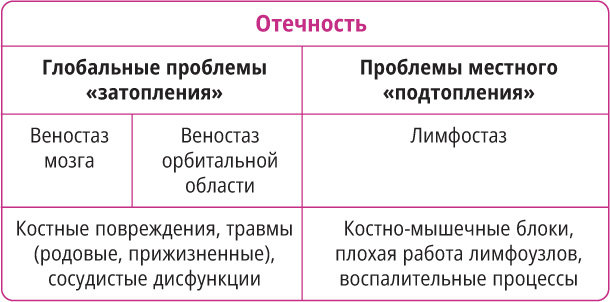 Чтобы эффективно бороться с деформациями, надо разобраться с видами и причинами отечности. Не затрагивая серьезных системных болезней, которые могут вызывать отечность глаз, разделим остальные на две большие группы, имеющиеся у условно здоровых людей: глобальные проблемы «затопления» и проблемы «подтопления» (таблица ниже).