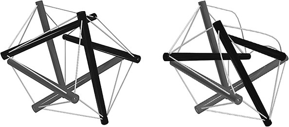 Образно биомеханическую структуру нашего организма можно изобразить в виде конструкции тенсегрити (рис. 4.30). Она имеет вид многогранника, состоящего из жестких ребер и мягких эластичных соединений. Конструкция не является стабильной и может менять свою форму при приложении нагрузки. Если представить, что жесткие ребра это кости, а эластичные соединения это мышцы, то с точки зрения модели тенсегрити это и будет биомеханическая система нашего организма.