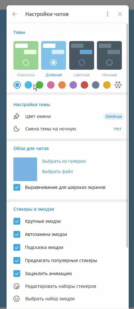 Здесь вы можете задать тему, цвет имени, задать обои для чатов и так далее.