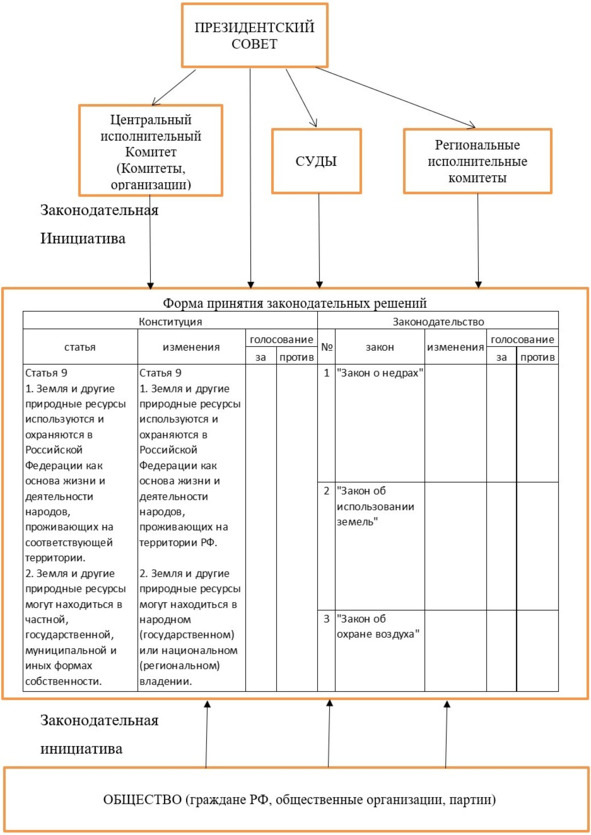 Каждый член общества должен иметь возможность вносить свои предложения, которые впоследствии на электронной площадке обсуждают активные граждане. Итак: размещение предложения обсуждение принятие (отклонение). Законодательные решения принимаются большинством голосов граждан, принявших участие в голосовании по проекту закона. Президентский Совет, правительственные структуры, органы власти, общественные организации, граждане РФ все имеют право законодательной инициативы. Поэтому социальной базой для проведения в жизнь лево-консервативной идеологии являются граждане, осознавшие себя как субъекты принятия государственных решений и проявляющие законодательную и управленческую инициативу. В перспективе все совершеннолетние граждане должны стать такими субъектами, но 23% маргиналов все равно будут. Можно считать это уровнем допустимой погрешности.