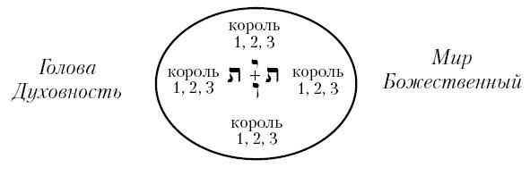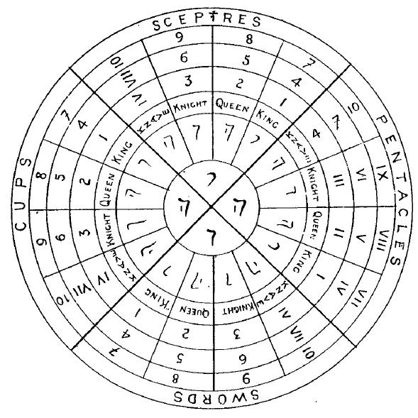 Чтобы представить этот порядок в виде синтетической схемы, надо поместить Священное Имя в центре круга, разделенного на четыре части, каждая из которых соответствует буквам yod-he-vau-he. В каждой четверти из центра круга лучами будут расходиться карты, аналогичные буквам Тетраграмматона.