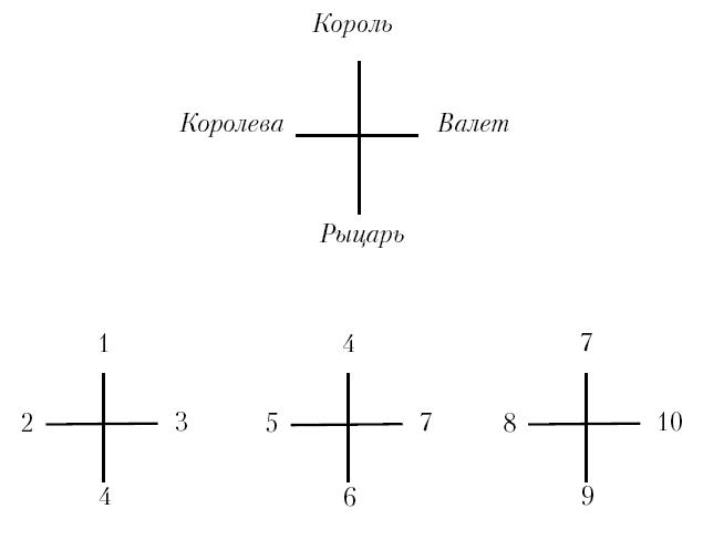 Стоит только сравнить последнюю схему, которая представляет 4 масти, с первой, которая изображала (только) одну из них, и сразу видно, что принцип, по которому построены обе схемы, один и то же, хотя их применение различно.
