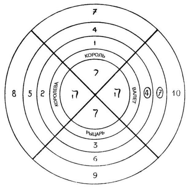 Отсюда карта 10 действует среди номеров также, как паж среди карт-картинок, т. е. служит переходу. От чего к чему? От одной масти к другой.