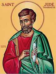 Иуда Фаддей изображался с булавой символом его мученичества в Персии, посохом или с плотницким «наугольником» намек на его профессию а также с веслом, лодочным крюком или с кораблем символами его миссионерских путешествий. Алебарда также атрибут св. Иуды, который во время путешествий со Св. Симоном был ею убит.