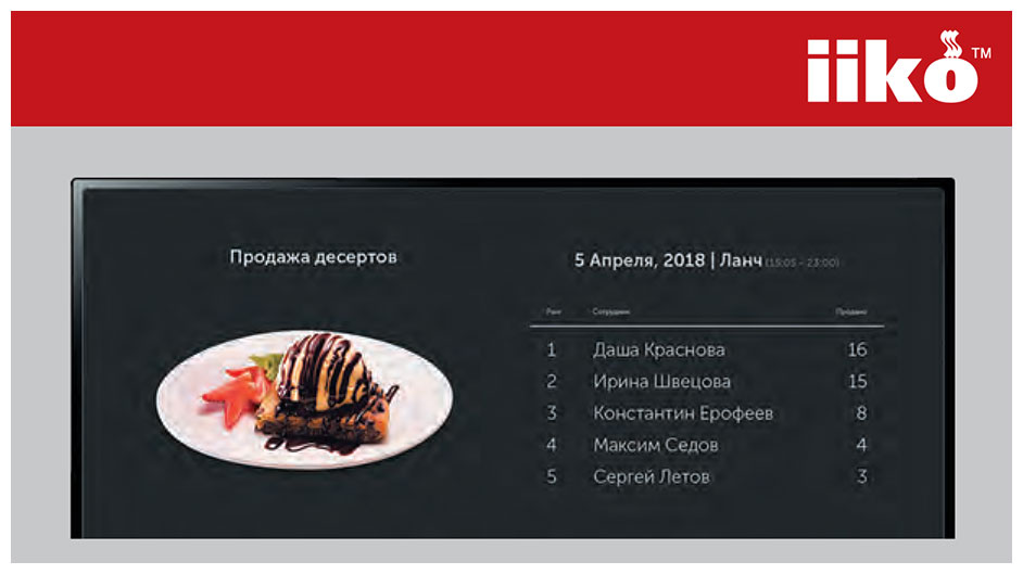 А чтобы стимулировать продажи конкретных блюд, организуйте среди со трудников соревнование с бонусом для победителя. Настенный экран iikoUpsellDashboard в реальном времени показывает количество чеков с продвигаемым товаром и текущий рейтинг по каждому сотруднику.