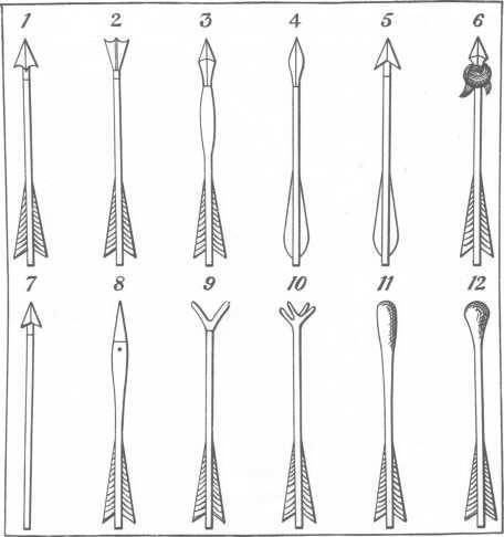 1, 2, 3, 4, 5, 6, 7 военные стрелы; 6 стрела с бечевой, смоченной в масле для поджигания кораблей и домов; 7 стрела для легкого арбалета; 8 стрела для охоты на оленей; 9, 10 стрелы для охоты на крупных птиц; 11, 12 стрелы для охоты на пернатую дичь. Последние не имели металлических наконечников и были затуплены, чтобы не испортить дичь.