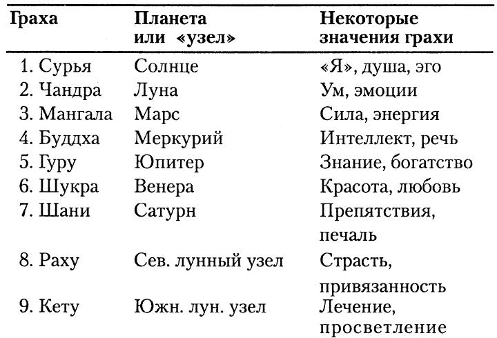 Грахи движутся в направлении против часовой стрелки, за исключением Раху и Кету, которые движутся по часовой стрелке. (Девять Грах обычно обозначаются в сокращенной форме.)