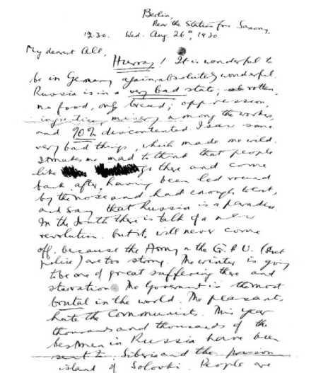 И уж совсем кажется фантастикой, что в 1930-х годах, при Сталине, эта компания продолжала действовать под британским флагом, и, что, более того, продолжался набор английских специалистов. И что, более того, СССР продолжали "навещать" британские журналисты и советники английского правительства, которым открывался доступ в самые отдалённые уголки страны без каких-либо ограничений, хотя представителям из других стран доступ в страну был закрыт. Приведём отрывок из письма английского журналиста и сотрудника английского правительства, Гарета Джонса (Gareth Jones) своим родителям (1930 или 1931 год):