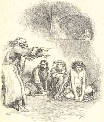 Преданный Каюс продолжал настаивать, чтобы король не оставался в эту непогоду под открытым небом. И ему, наконец, удалось уговорить короля войти в шалаш, стоявший вдали, в поле. Первым в шалаш вошел шут. Но сейчас же в ужасе отшатнулся, крикнув, что в шалаше какой-то призрак. Однако, оказалось, что этот призрак был просто сумасшедший нищий. Он тоже искал здесь убежища от непогоды, и своей безумной болтовней напугал шута. Этот нищий не то действительно был лишен рассудка, не то притворялся сумасшедшим, чтобы вернее вызвать сострадание у добрых людей. Такие несчастные в прежние времена часто ходили по деревням. Почему-то они называли себя то «бедным Томом», то «бедным Турлигудом» и повторяли: