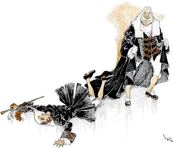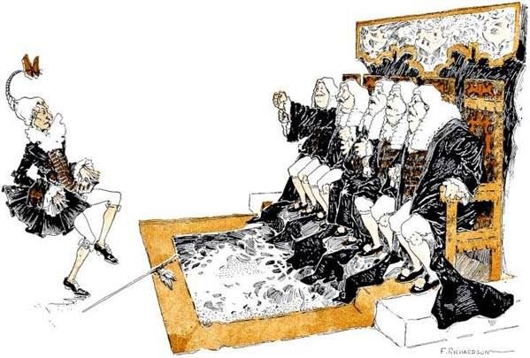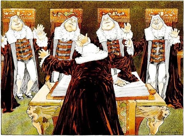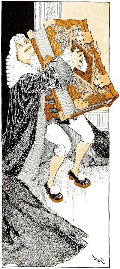 Поэтому главный советник принес книгу огромный старый том, который имел затхлый запах и был накрепко заперт серебряным замком. Затем нужно было найти ключ, что было нелегкой задачей; но, наконец, на столе лежала великая книга законов, и все пятеро толстых советников согнулись над ней.