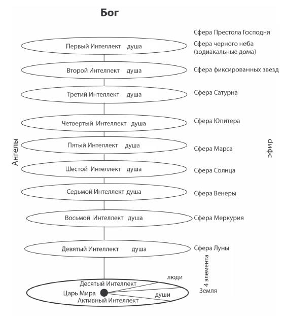 Иранский философ Ибн Сина (Авиценна) вслед за аль-Фараби[58] в духе неоплатоников описал систему Десяти Интеллектов (Умов, Aql عقل), нисходящих по иерархии от высшего начала Бога. Каждый из Интеллектов представлял собой Ангела, то есть высшее существо, онтологически располагающееся между Богом и телесным земным подлунным миром. Два высших Ума-Ангела относились к надкосмической сфере чистых Начал (Принципов), семь последующих соответствовали планетарным небесам, а последний, Десятый Интеллект представлял собой нижний полюс всей ангелической оси в подлунном мире. Этот Десятый Интеллект и отождествлялся с Активным Интеллектом (νούς ποιητικός) Аристотеля. Десятый Интеллект был самым слабым и помещенным в самую плотную среду, состоящую не из эфира, а из более грубых подлунных стихий. Но именно благодаря ему и был конституирован феноменологически земной мир. Всякое разумное существо земного мира является причастным к этому Десятому Интеллекту в той мере, в какой оно по-настоящему разумно. Но даже если оно неразумно, но имеет душу (как животные и растения) или даже только форму (как камни и все остальные неодушевленные предметы), оно сопряжено с Десятым Интеллектом, так как происходит именно из него и в нем содержится в качестве эйдоса.