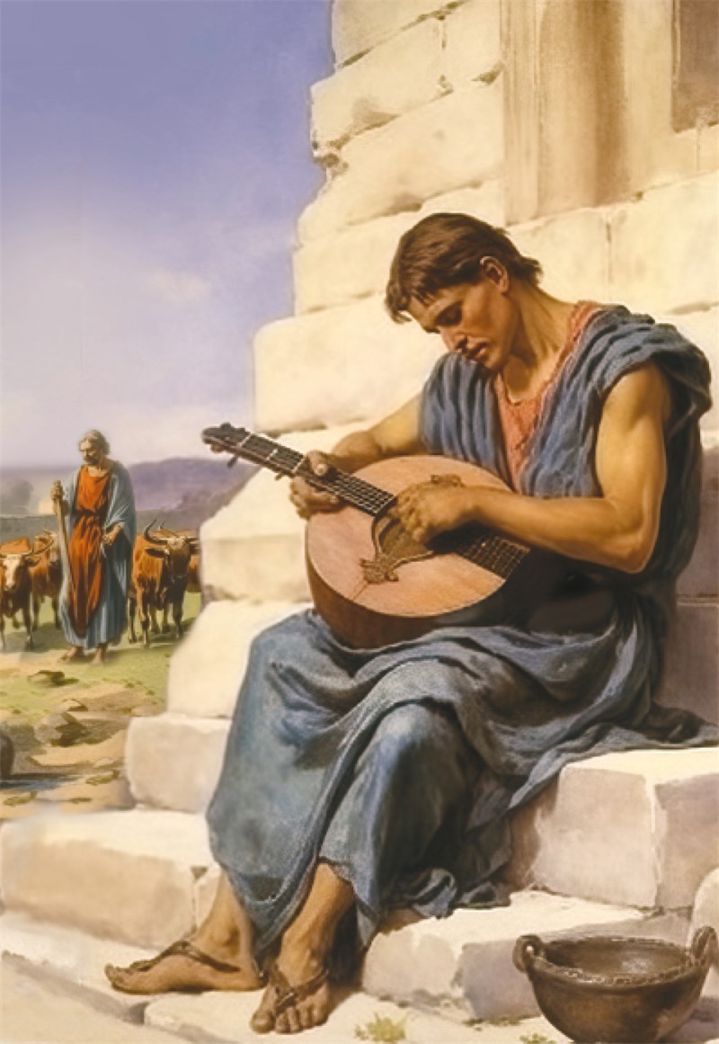С Олимпа повел Гермес Аполлона в Пилос, захватив по дороге сделанную им из щита черепахи лиру. В Пилосе он показал, где спрятаны коровы. Пока Аполлон выгонял коров из пещеры, Гермес сел около нее на камне и заиграл на лире. Дивные звуки огласили долину и песчаный берег моря. Изумленный Аполлон с восторгом слушал игру Гермеса. Он отдал Гермесу за его лиру коров так пленили его звуки лиры. А Гермес изобрел себе свирель, любимый музыкальный инструмент пастухов Греции.