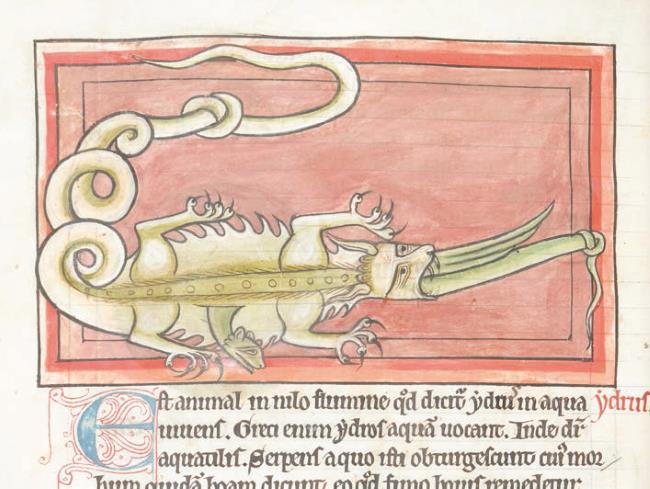 Но даже у самых свирепых чудовищ были свои враги. Заядлым противником крокодила был гидр (или гидрус). В бестиариях рассказывалось, что гидрус обитает в реке Нил и когда он видит спящего на берегу крокодила, то входит внутрь него через открытый рот. Чтобы ему легче было проскользнуть через крокодилью глотку в чрево, он сперва выкатывался в грязи. Согласно тексту бестиария, крокодил невзначай заглатывает живого гидруса, который, однако, не стремится задерживаться внутри и, разодрав крокодилу все внутренности, выходит из него наружу целым и невредимым. Момент проникновения гидруса в крокодила запечатлен на миниатюре бестиария из Британской библиотеки. А на миниатюре из Абердинского бестиария можно увидеть момент его «выхода» из крокодильего чрева. Само изображение гидруса в обоих примерах малопримечательно: вид у этого зверька довольно невзрачный, чем-то напоминает обычную змею. На его фоне крокодил выглядит гораздо более зловещим. Абердинский бестиарий один из самых роскошно украшенных английских манускриптов XII века приводит довольно подробное описание гидруса. Там он относится к разряду водяных змей, чем объясняется и его название (от древн. греч. hydor «вода»). Как сообщает нам бестиарий, те, кого укусит гидрус, распухают, и спасти их можно только с помощью бычьего навоза. Таким образом, можно предположить, что зверек представлял опасность и для человека.