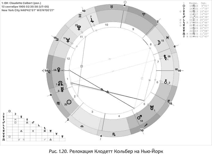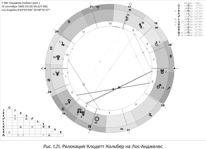 Однако Клодетт почти не жила во Франции ребенком родители привезли ее в США. Сначала в Нью-Йорк, где ее замечательная Венера становится управительницей МС и оказывается на Асценденте (рис. 1.20), а Марс попадает в 5-й дом. Здесь она изучала искусство и дизайн одежды, играла на Бродвее, и Нью-Йорк навсегда остался для нее любимым местом на Земле. Однако наибольшего успеха Клодетт достигла в Голливуде. На рис. 1.21 вы видите ее релокацию на Лос-Анджелес. Самое интересное в этой карте то, что все четыре угловых куспида соединяются с планетами: на МС находится Луна, управительница натального МС и Асцендента релокации, на IC Солнце, на Асценденте Нептун, на Десценденте Уран. К Урану из 3-го дома образует трин Меркурий (расположенный в обители и в экзальтации в Деве, в соединении и параллели с восходящим лунным узлом), и успехи Клодетт в какой-то степени связаны с ее необычными языковыми способностями. Она могла одинаково свободно говорить по-французски и по-английски, причем по-английски и с американским, и с британским произношением.