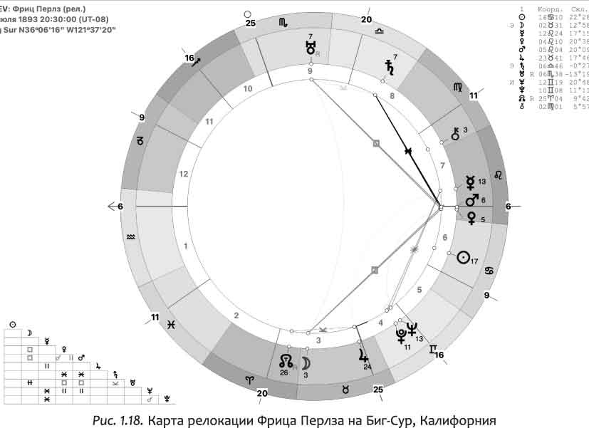 Марс в релокации по-прежнему управляет МС, но теперь он очень точно соединяется с Десцендентом, и Венера, по-прежнему управительница IC, рядом. То есть у Перлза в Калифорнии возникла прекрасная возможность передать тот потенциал, который мы обнаружили в натальной карте, другим людям. Но кроме того, в Биг-Суре на IC находится не Сатурн, а Юпитер, а это совсем другое дело! В Институте Эсален к Перлзу относились с большим уважением, он там обосновался и даже построил красивый дом с видом на океан. Очень удачный переезд. Однако в 1969 году Перлз покинул Эсален и уже в следующем году ушел из жизни: он умер от сердечной недостаточности в Чикаго в марте 1970 после операции на сердце.