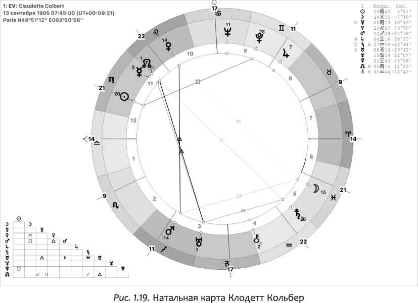 Клодетт родилась в Париже, а звездой стала в Голливуде. Уже в натальной карте (рис. 1.19) можно заметить потенциал успешной актрисы: Венера, управительница Асцендента, расположена во Льве в 10-м доме и образует точный секстиль к Асценденту, а также очень точный сходящийся трин с Марсом; Луна, управительница МС, из 5-го дома дополняет трин Венера-Марс до замкнутой конфигурации. Близость Нептуна к МС может намекать на успех в кинематографе, и мы скоро увидим, что в Голливуде Нептун Клодетт оказался близко к Асценденту.