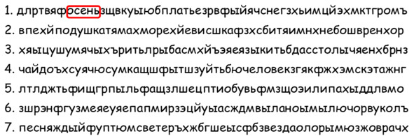 Инструкция: найдите и выделите в каждой строчке спрятанные слова, как показано в строке 1.
