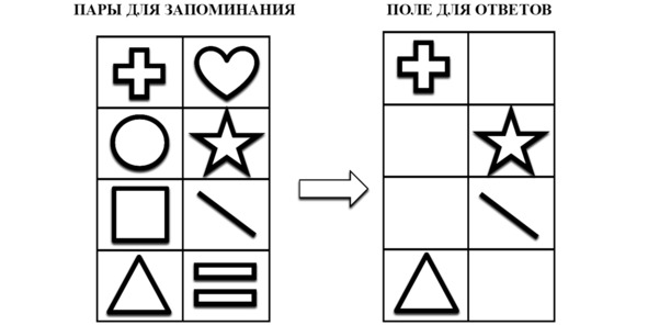 Инструкция: рассмотрите внимательно пары картинок в течение минуты. Постарайтесь запомнить изображения парами. По истечении времени закройте поле с заданием листом бумаги и внесите недостающие фигуры в поле для ответов.