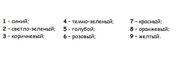 Инструкция: каждому числу соответствует определенный цвет. Ваша задача закрасить фрагменты изображения указанными цветами. Используйте цветные карандаши.
